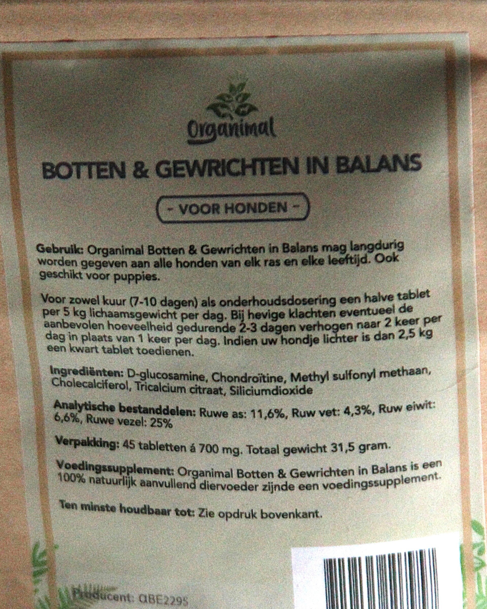 Organimal Botten en Gewrichten – in Balans is uitermate geschikt voor langdurig gebruik. Wij raden het zelfs aan om dit als onderhoudsdosis toe te dienen aan jouw hond. Structurele ondersteuning is in bepaalde gevallen zeer gewenst. Raadpleeg een dierenarts wanneer je hond al medicijnen gebruikt en je wilt Botten en Gewrichten – in Balans toedienen. Dit om eventuele bijwerkingen te voorkomen.