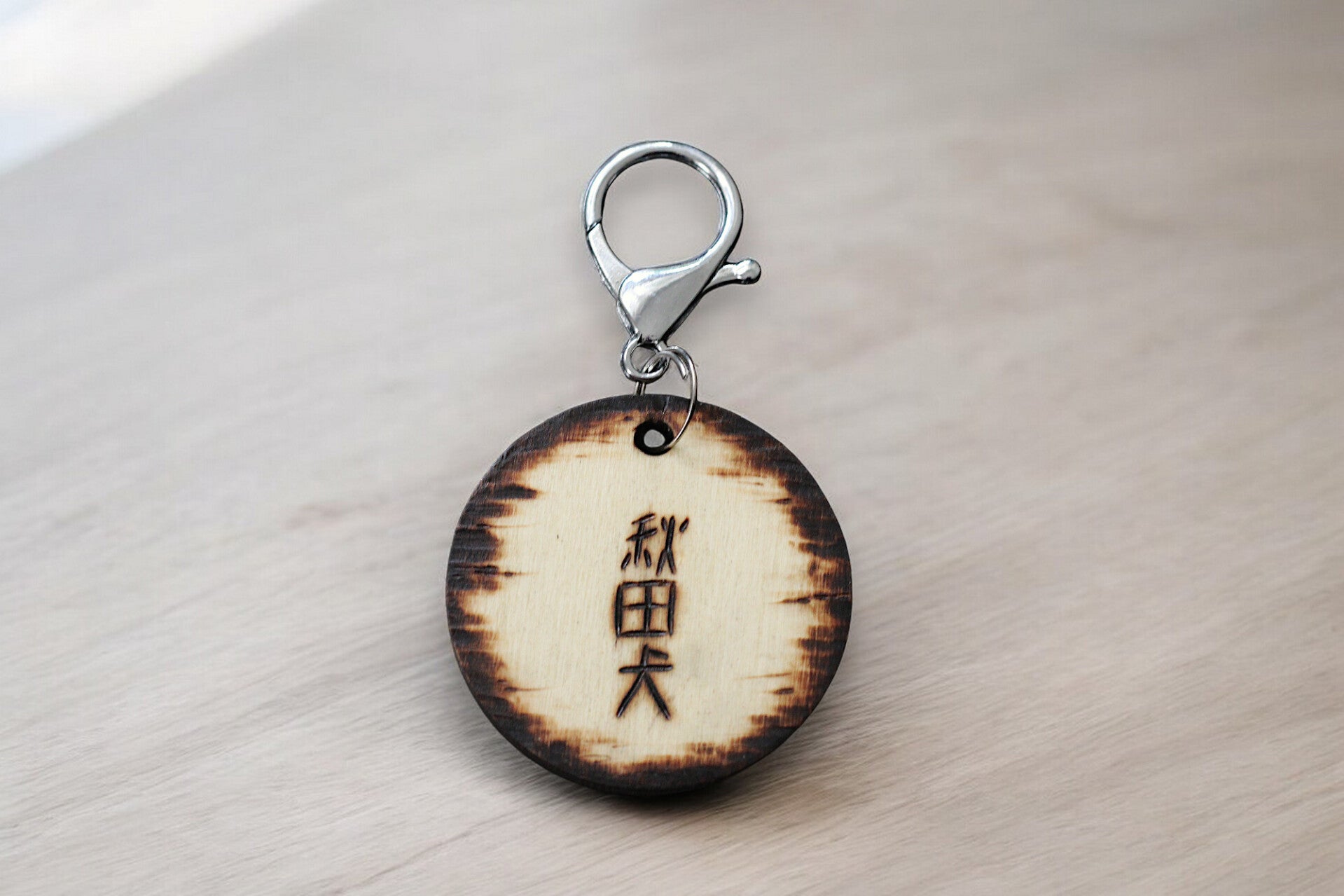 Unieke, ronde hondenpenning of sleutelhanger, handgemaakt en door middel van pyrografie gebrand. Afgewerkt met alrylverf en een laagje lak ter bescherming.
