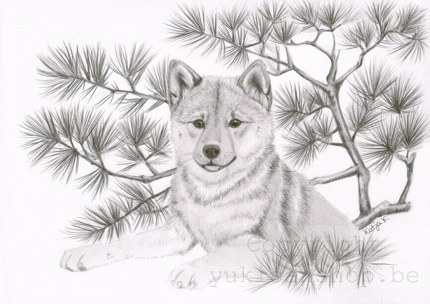 Ontdek deze prachtige print van een Japanse hond, zorgvuldig gereproduceerd van een originele potloodtekening. De fijne lijnen en zachte schaduwen brengen het karakter en de rust van het ras op een subtiele manier tot leven.